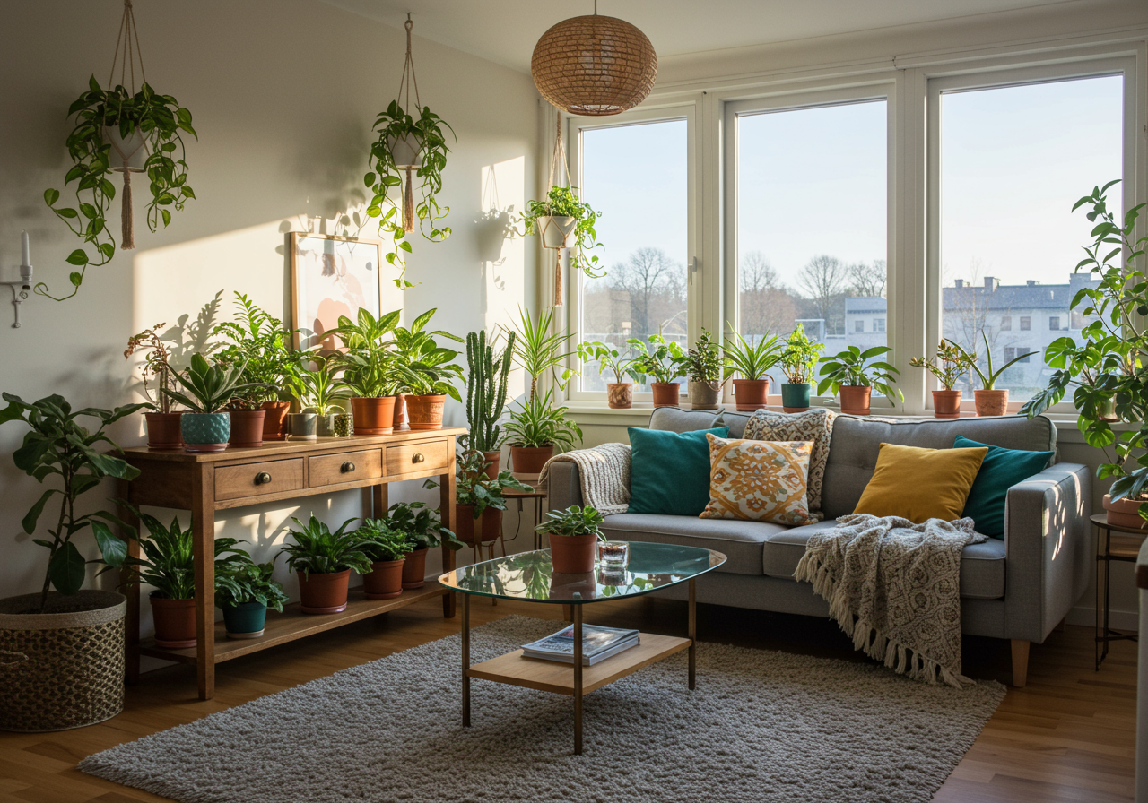Handmade quilts, rugs, sculptures, and pottery add an artistic touch, paying homage to the style's creative origins. The infusion of nature is fundamental, achieved through an abundance of plants and the warm glow of lanterns and string lights. Plush and comfortable furniture upholstered in rich, earthy tones or vivid hues, along with expressive art and wall hangings, complete the boho look, showcasing a harmonious blend of patterns and colors.