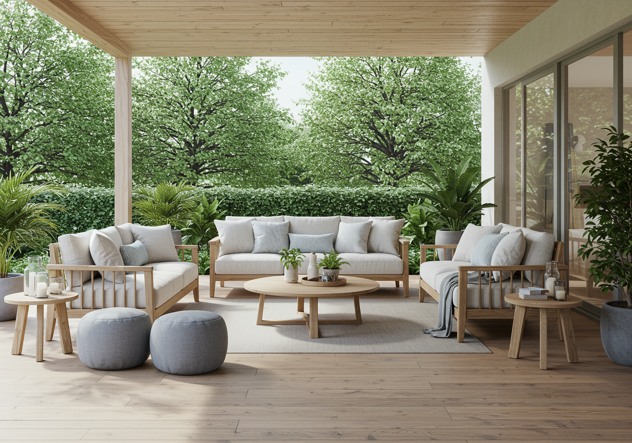 Create a comfortable indoor outdoor living area with plush seating, weather-resistant cushions, and cozy throw blankets for cooler evenings. This helps create a seamless transition from your interior space to your outdoor space.