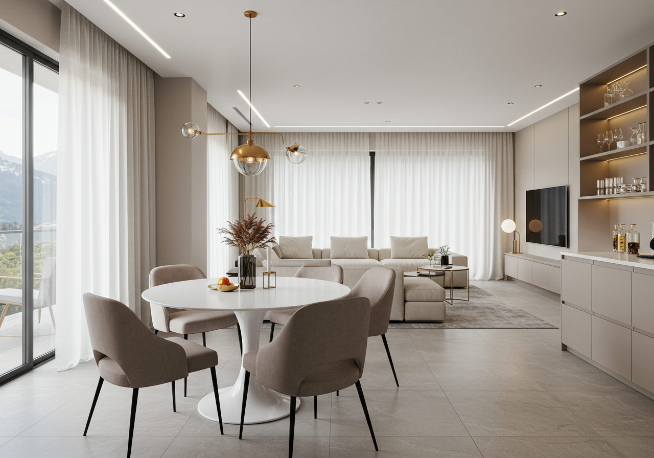 Clean lines and minimalist furnishings: Opt for furniture with straight lines and minimal ornamentation to achieve a contemporary aesthetic. Pendant lights help contribute to this aesthetic.